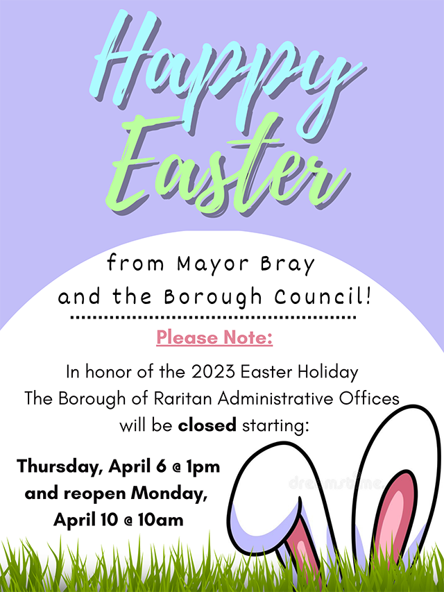 Posted April 03, 2023In honor of the 2023 Easter Holiday the Borough of Raritan Administrative Offices will be ๐๐๐๐๐๐ starting: