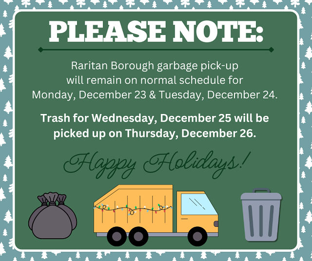 Raritan Borough garbage pick-up will remain on normal schedule for Monday, December 23 & Tuesday, December 24.