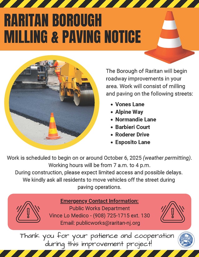 Posted October 01, 2025The Borough of Raritan will be beginning roadway improvements; work will consist of milling and paving on the following streets:
