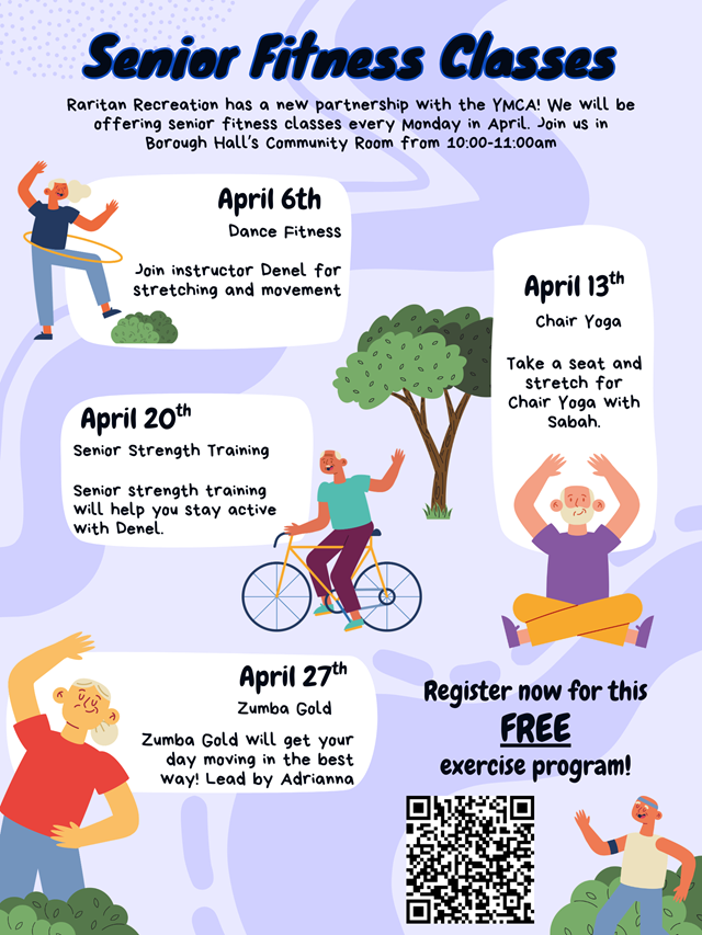 Posted March 23, 2026Raritan Recreation is partnering with the YMCA to offer Senior Fitness Classes every Monday in April. Classes will be held at Borough Hall’s Community Room from 10:00–11:00 a.m. This is a great opportunity to stay active, improve mobility, and enjoy a welcoming group setting.